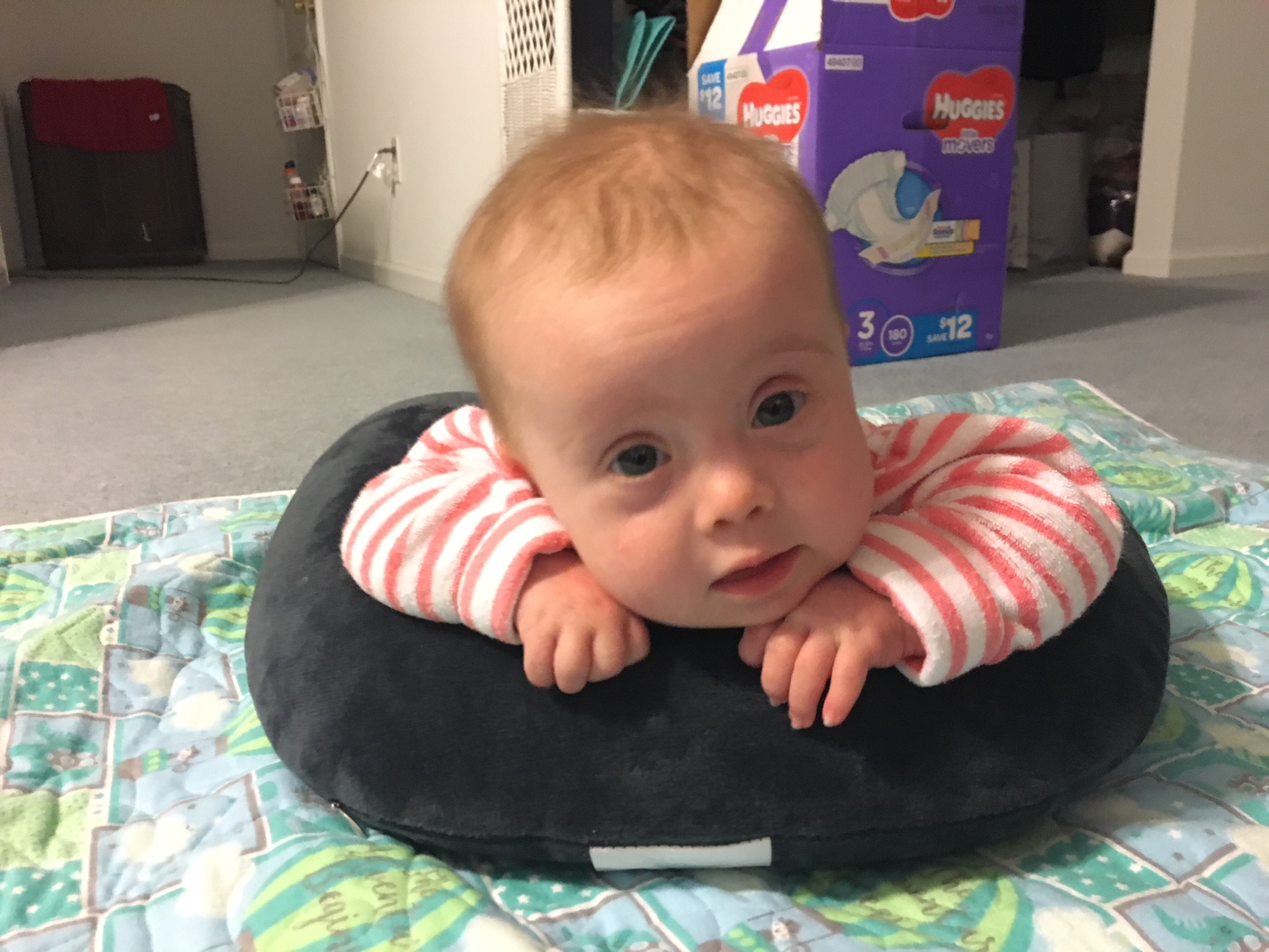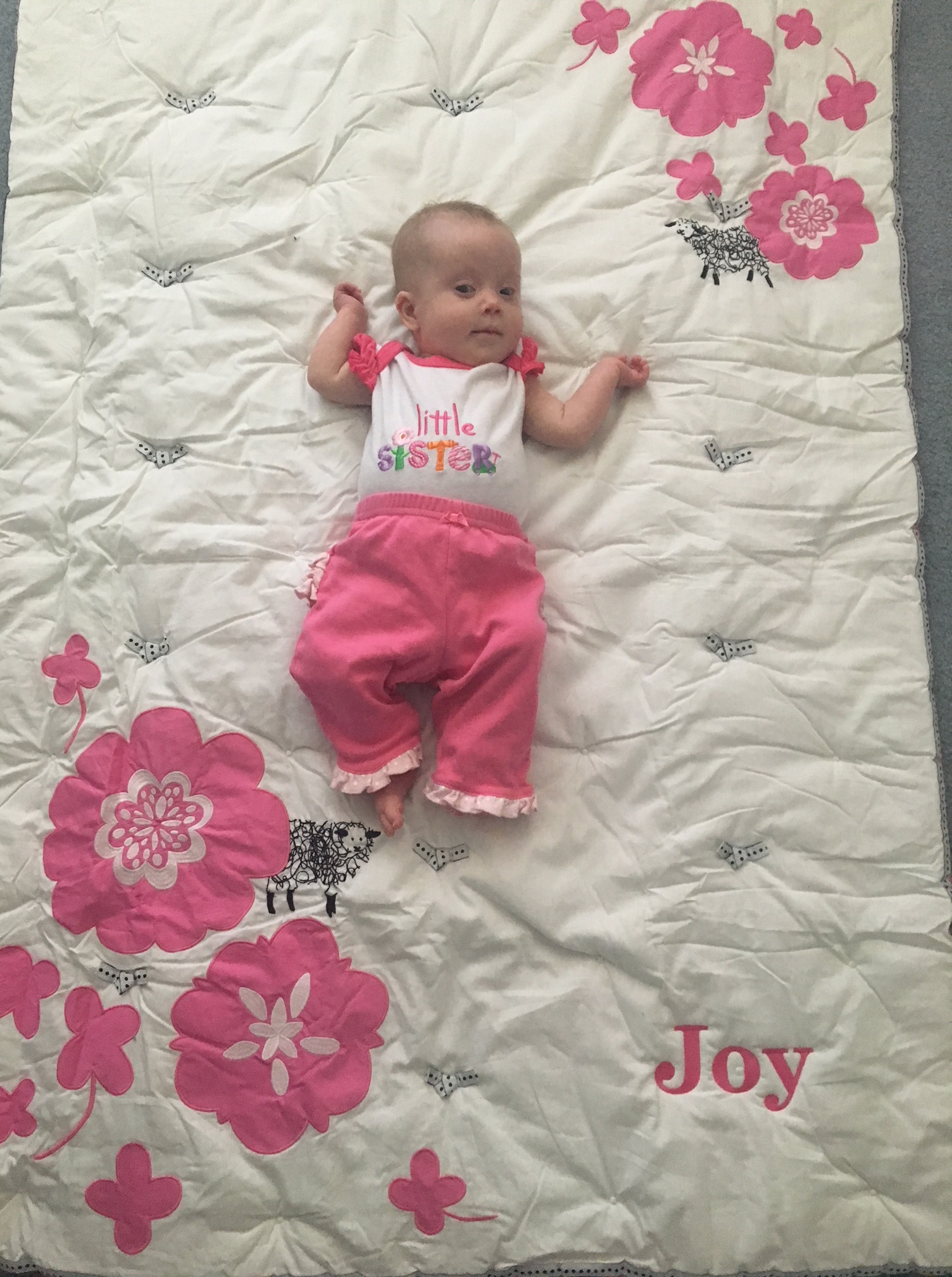 Joy can now roll over from her back to her tummy. The first time I saw Joy do it, I almost cried tears of joy. She loves being on her tummy and really wants to start crawling. I’m already looking at baby gates.