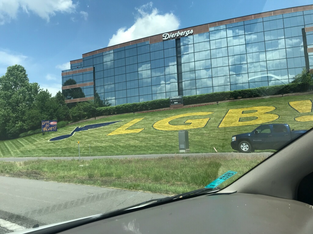 Yesterday, Kathleen posted to the group message thread (a group of nine, mostly Paytons) a photo of the Dierbergs main office. The green space that faces Hwy 40 has been brightly painted with the letters L G B ! For several moments, I wondered: Why did they leave off the T (and the Q). Was there not enough space on the lawn? Was it a simple typo? Is Dierbergs only gradually and incrementally supporting the LGBT community? Maybe next year Dierbergs will add the T. That would be nice.